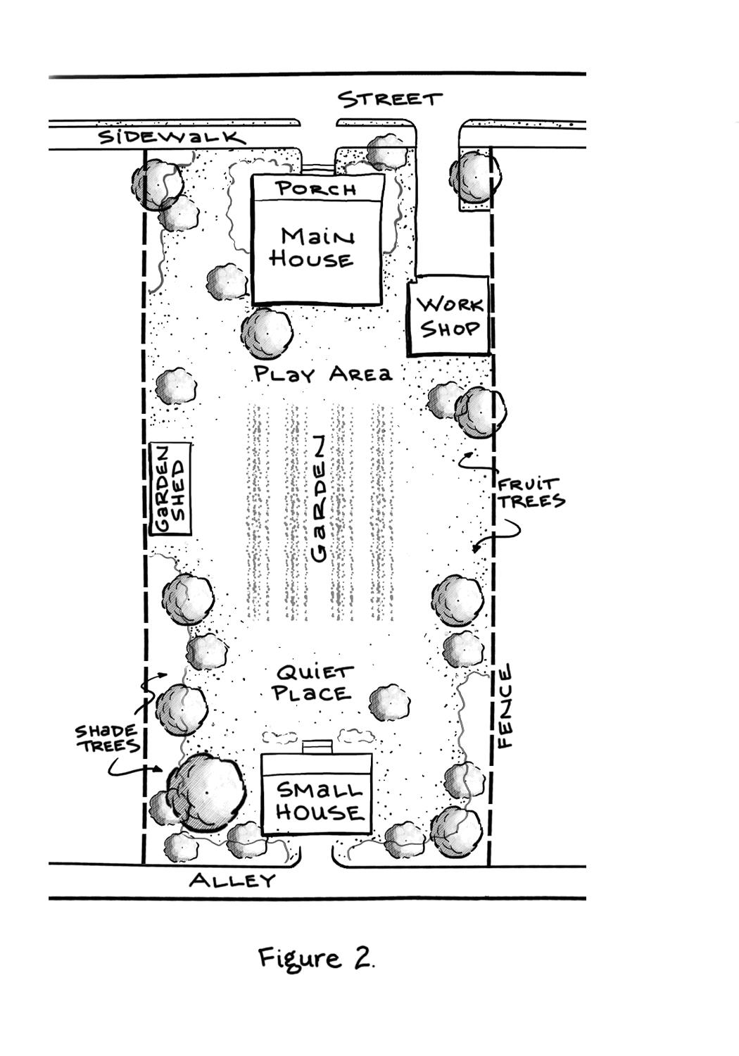 Of course if the houses are set forward like this it means the gardens will have to be located behind, in the long back yards that would stretch from the rear of each house, with the grandparents' quarters being located at the far end of the garden, but accessible by a small alleyway that runs across the back of each lot. The advantage of this arrangement is that it would define a space -- bounded by the larger house in front and the smaller one behind -- of relative peace and quiet: a place not open to the street, where a person could sit and meditate, or think, or sing the baby to sleep, and not be bothered (see Figure 2).